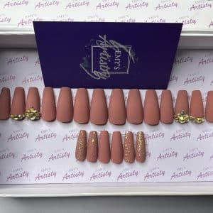 Each set contains 20 press-on nails in a box with an Emy’s Artistry Prep Kit for nail application, an instruction card, and a gift.