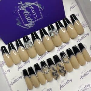 Each set contains 20 to 24 luxury hand painted press-on nails in a box with Emy’s Artistry Prep Kit for nail application.