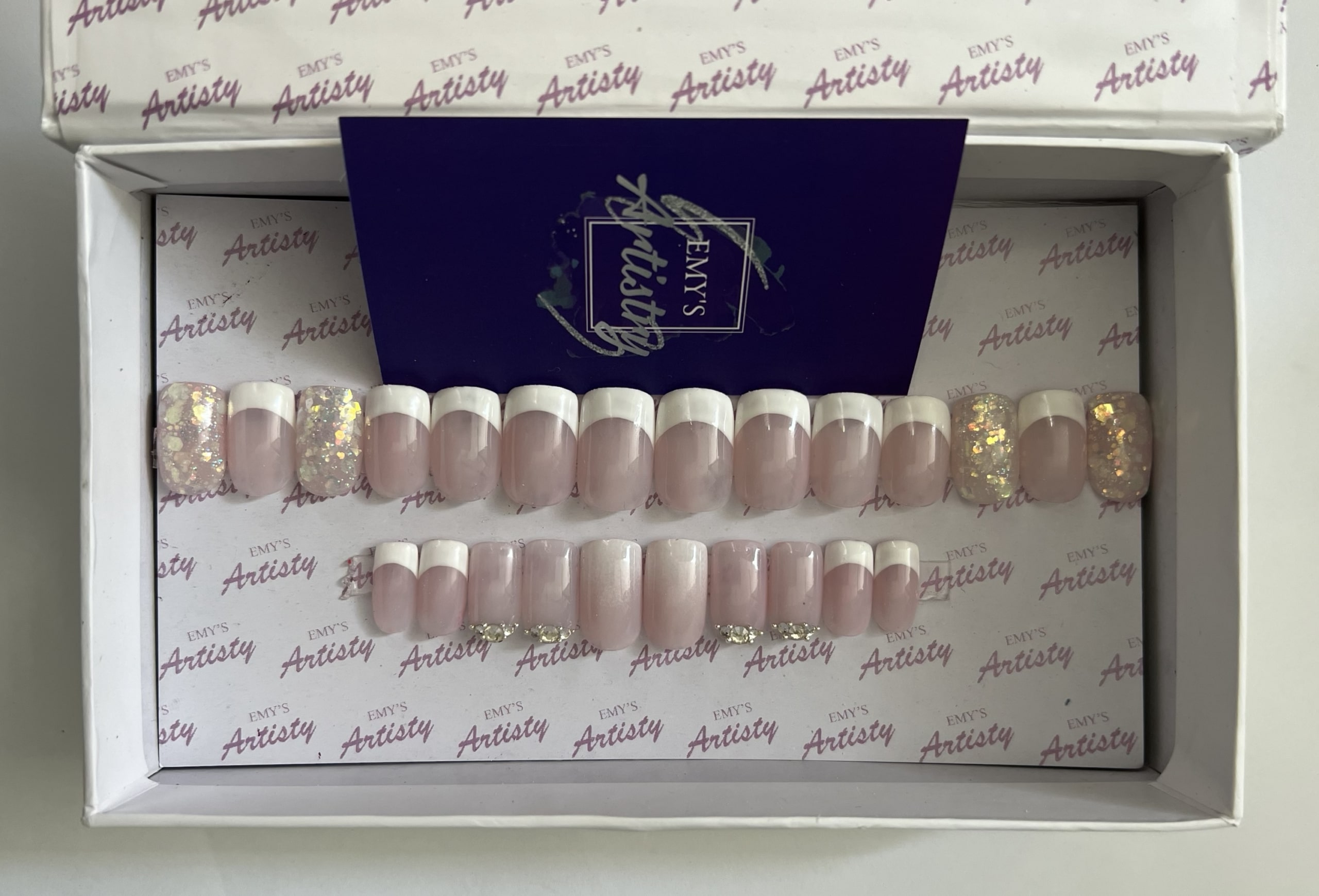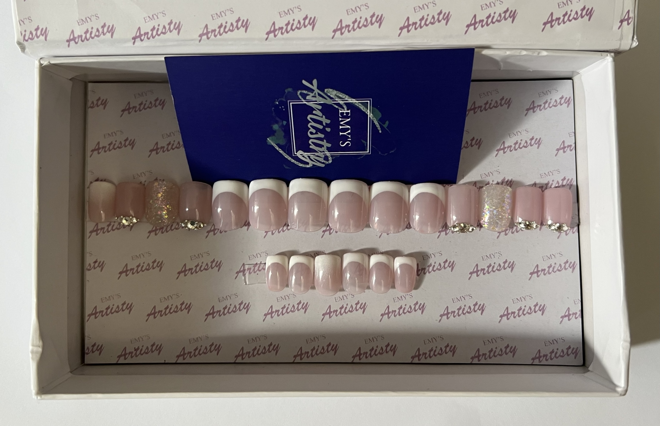 Each set contains 20 press-on nails in a box with an Emy’s Artistry Prep Kit for nail application, an instruction card, and a gift.