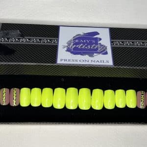 Each set contains 20 press-on nails in a box with an Emy’s Artistry Prep Kit for nail application, an instruction card, and a gift.
